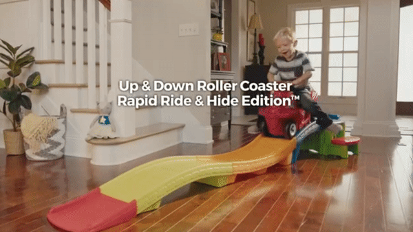 A durable indoor/outdoor ride-on “Up & Down” roller coaster