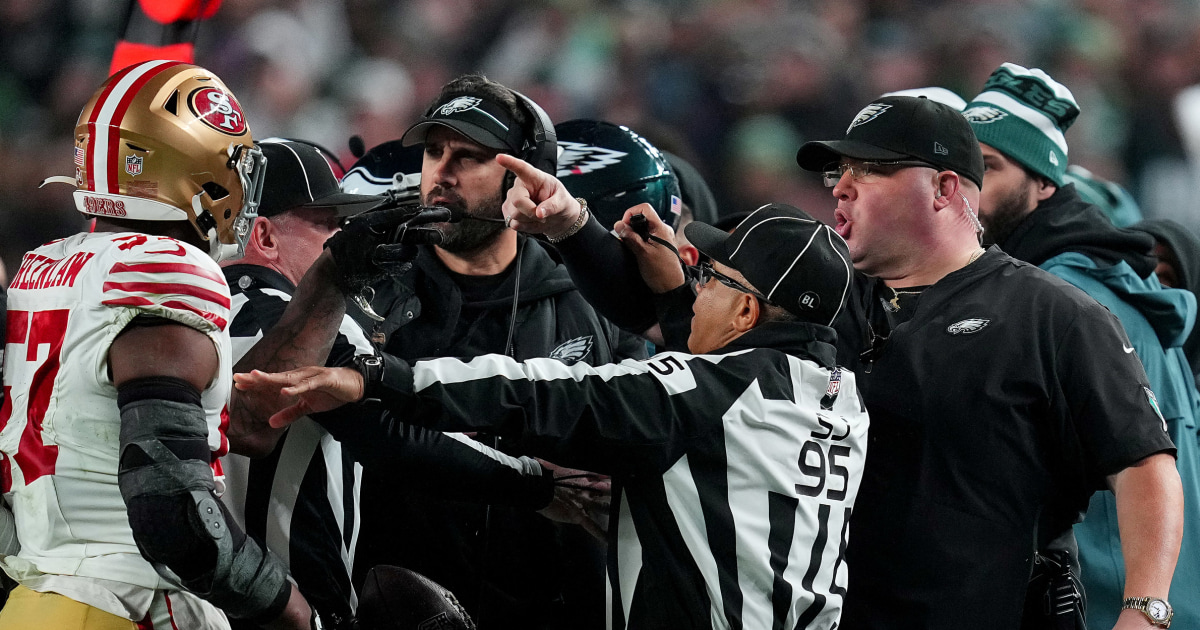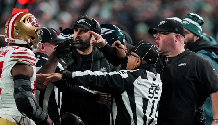 San Francisco 49ers linebacker Dre Greenlaw was thrown out of Sunday’s game against Philadelphia after being called for a personal foul during a scuffle with an Eagles staffer.