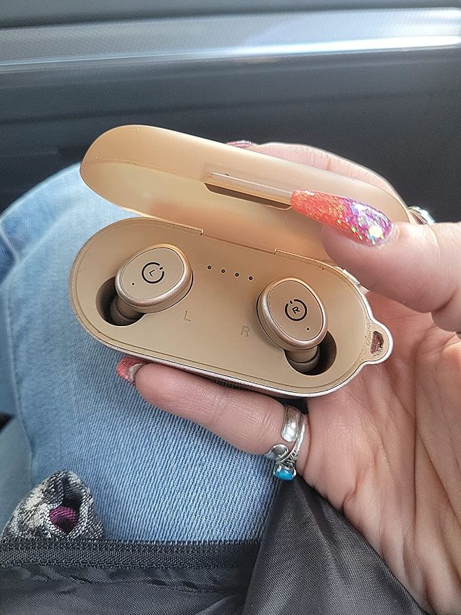 Promising review: “Best decision! These are the greatest headphones ever! I saw them on TikTok months ago and added them to my wishlist. I got a new phone that doesn’t have the headphone port so I decided it was time to finally buy them. They are amazing and I probably won’t ever take them out of my ears! 😂” — Katlyn D Arnold