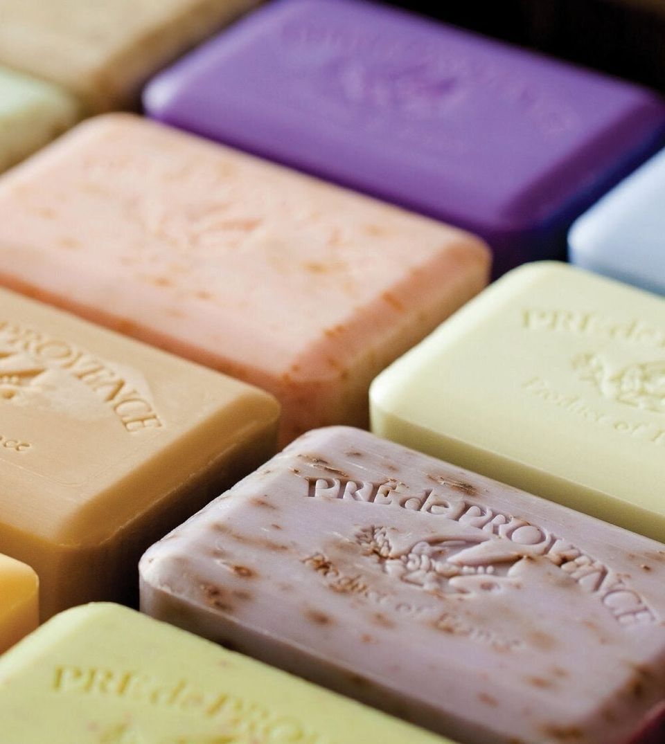A bar of quadruple-milled, shea butter–infused French soap to soften rather than dry out their skin