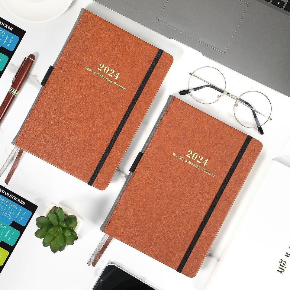 A planner with a stately faux-leather cover, tabbed sections, gold foiling and weekly and monthly sections