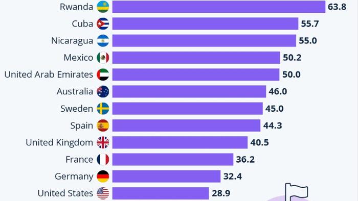 In Europe, Scandinavian nations lead, like Sweden at 45 percent, Finland at 45.5 percent and Iceland at 46 percent. Spain follows suit with 44.3 percent.