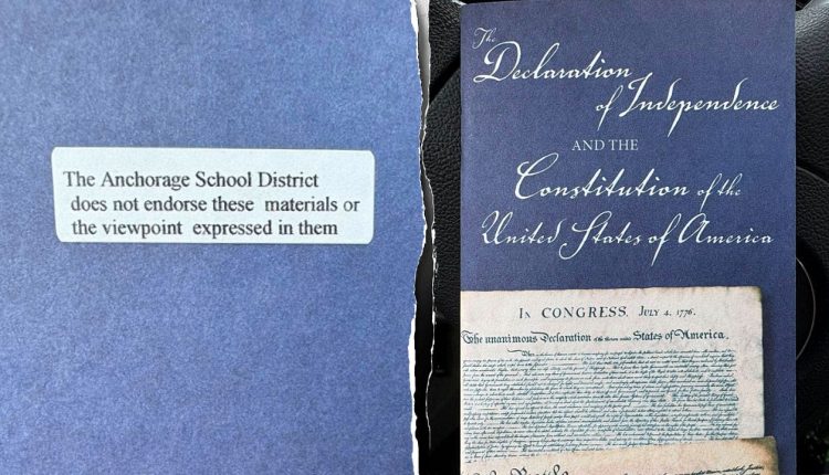 “Today my daughter brought home a pamphlet with the Declaration of Independence and the U.S. Constitution,” Karen Waldron posted to Facebook. “On the back was a sticker saying that the Anchorage School District ‘does not endorse the materials or viewpoints expressed in them.’”