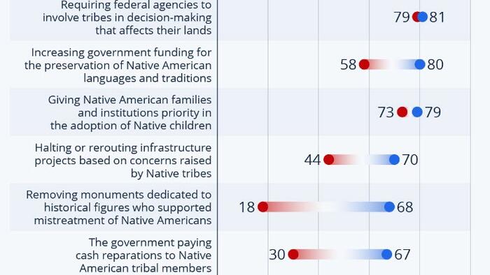 These include the proposed removal of monuments dedicated to historical figures who supported mistreatment of Native Americans (18 percent Republicans to 68 percent Democrats), the question of halting or rerouting infrastructure projects based on concerns raised by Native tribes (44 percent Republicans to 70 percent Democrats), giving Native Americans an advantage in college admissions decisions (32 percent Republicans to 67 percent Democrats) and the government paying cash reparations to Native American tribal members (30 percent Republicans to 67 percent Democrats).