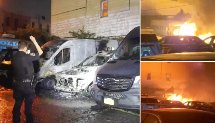 The vehicles, including six marked and two unmarked vehicles, caught fire in the lot at DeKalb Avenue and Central Avenue, about two blocks from the 83rd Precinct, police said.