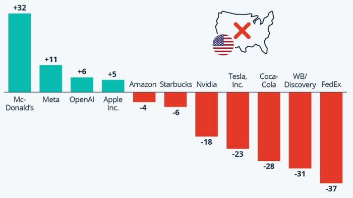 Data published by Axios looks more closely at how global sentiment on a selection of U.S. brands changed between January and March, 2025. Of the 16 brands surveyed, 12 saw declines in favorability, with FedEx, Chevron and WB/ Discovery having seen the biggest drops (each down more than 33 percent).