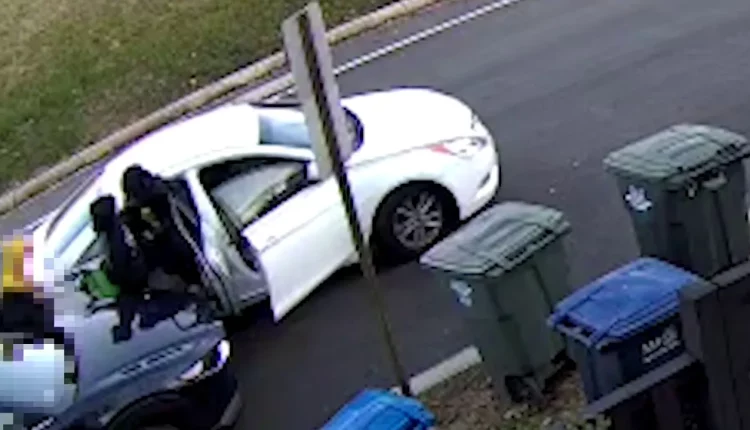 The video shows a white car blocking the path of an American University college student and two suspects surround the young adult’s pathway.