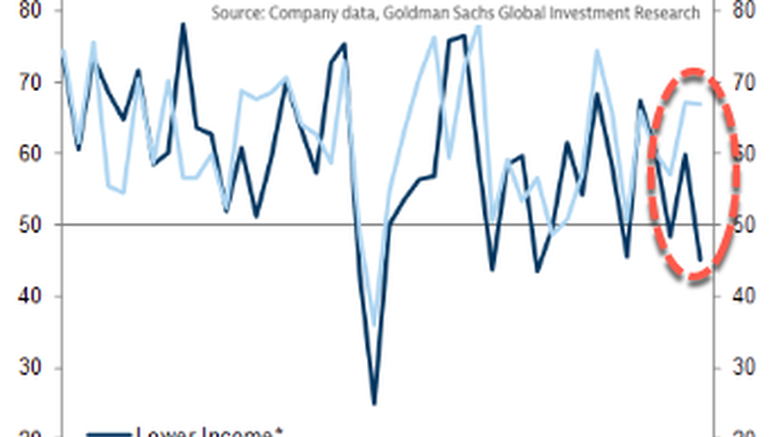 New data from Goldman analyst Ronnie Walker highlights the widening divide among consumers. He noted that lower-income households are weakening noticeably beneath the surface of otherwise solid aggregate retail trends.