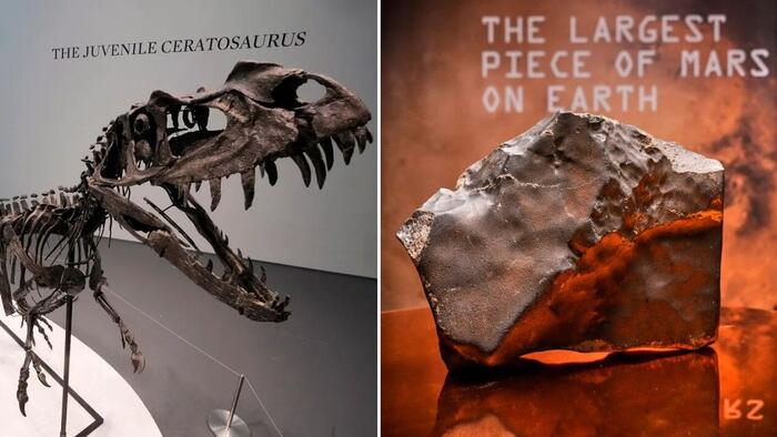 A 54-pound fragment of Mars, dislodged by a cosmic collision and hurled 140 million miles to Earth, became the most valuable meteorite ever sold at auction on Wednesday. But it was a rare young dinosaur skeleton that captured the spotlight – fetching more than $30 million in a frenzied bidding battle.