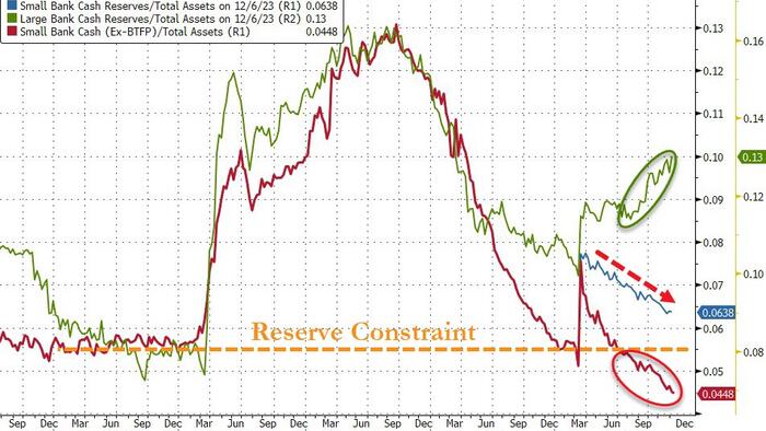Finally, the key warning sign continues to trend ominously lower (Small Banks’ reserve constraint – blue line), supported above the critical level by The Fed’s emergency funds (for now)…