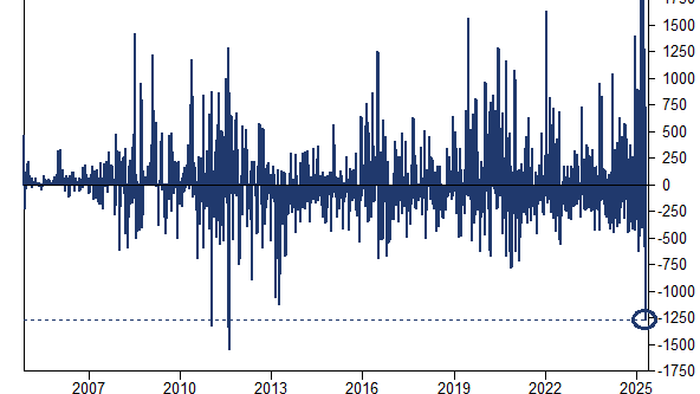 Cutting to the chase, it was an outsized session for GLD as the fund concluded the session as the 3rd most-traded ETF (which is unusual GLD) and witnessed its 3rd largest notional trading session since its inception in 2004. Volumes were notable on the desk as Goldman skewed (much) better to sell (mostly long sales) across spot (GLD) and the miners complex (GDX, GDXJ), with supply accelerating into the latter half of the session. As shown in the chart below, within primary market flows, GLD registered a -$1.3bn outflow (its largest daily outflow since the record 2011 slam when tremendous SNB intervention set a ceiling for gold that lasted nearly a decade) and GDX faced a -$200mm redemption (its worst daily outflow in the past 12 months).