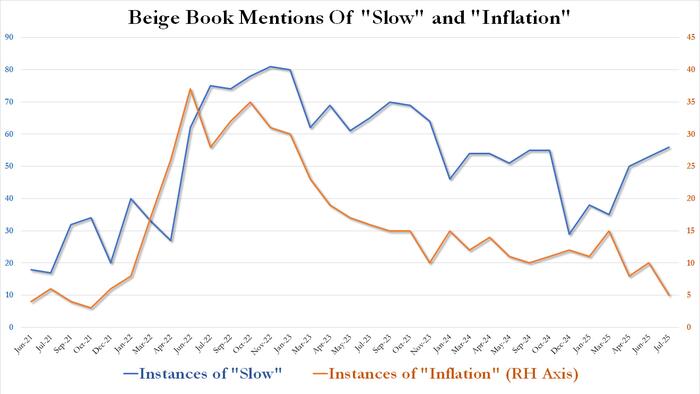 And finally, confirming that contrary to conventional wisdom the economic picture has been largely unchanged since April, the latest Beige Book found that contrary to prevailing media narratives, mentions of inflation actually dropped again, sliding to a new four year low of just 5 from 10 the previous month (effectively before the Biden inflationary explosion period) while mentions of “slow” rose to the highest since last October, just after the Powell Fed cut rates by 50bps. Overall, a very awkward report for a Fed that no longer has any excuse not to cut.