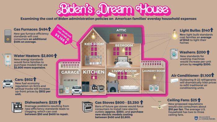 The Alliance for Consumers took an infographic from the Biden White House titled “Biden’s Dream Home,” which proposes new energy standards for various appliances, including air conditioners, stoves, washing machines, while the Department of Energy’s so-called Unified List of appliances includes microwave ovens, dehumidifiers and pool pumps.