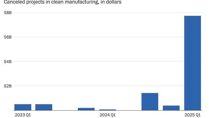 Industry investment has plummeted, with just $176 million in clean manufacturing announced in January—well below the usual $1 billion. “You see a lot of people watching and waiting,” said Jason Grumet of the American Clean Power Association. “If you don’t know if the inputs to your factory are going to dramatically increase in price — it slows things down.”
