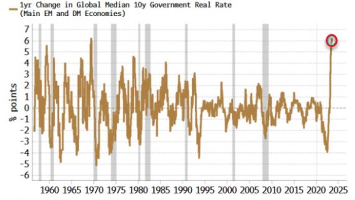 The global real yield of the largest EM and DM countries has increased by the most over one year since 1969, rising by over six percentage points.