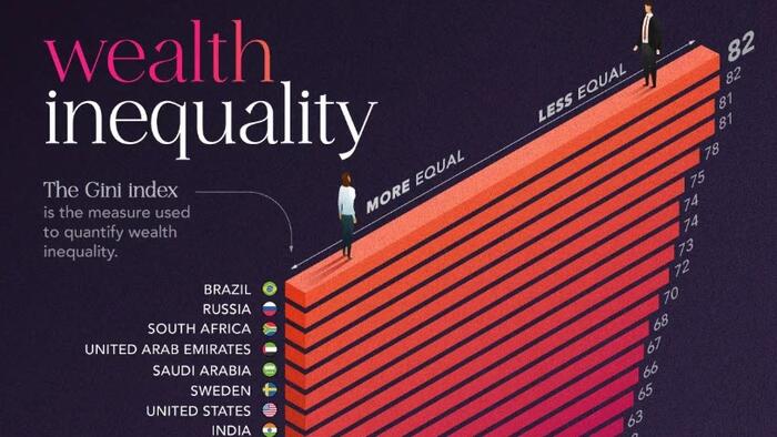 Brazil, Russia, and South Africa top the list for wealth inequality, each posting Gini coefficients around the low 0.8s.