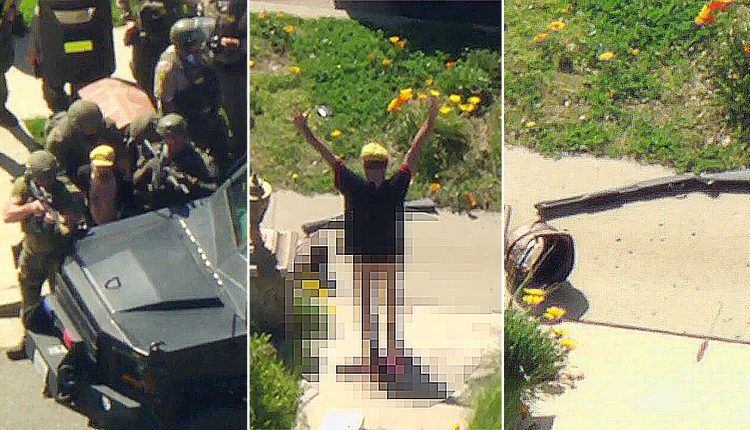 Footage captured a bizarre incident that unfolded in California Wednesday morning when an armed suspect surrendered to SWAT teams while wearing everything but pants.