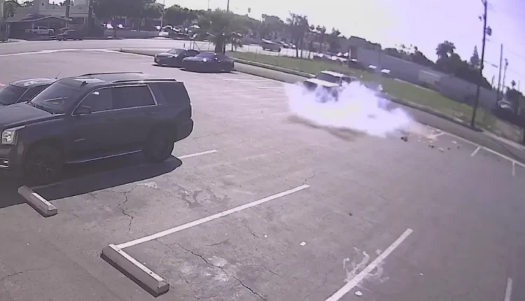 The department released surveillance video of the teddy bear explosion, which captures the moment the toy is seen exploding in the parking lot.