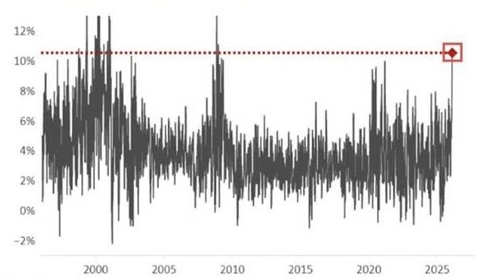 Next, we share a graph, courtesy of Nomura, that delves deeper into the recent dispersion. It compares the average move for all S&P 500 stocks over the last 20 days to that of the S&P 500 index. As the graph shows, the relative volatility of individual stock returns versus the market is now at levels last seen during the financial crisis and the dotcom crash.