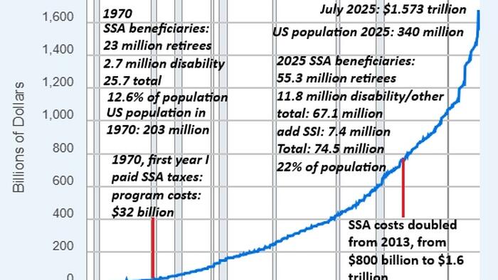 In 2025, the situation has changed. The US population increased 67% to 340 million, the number of SSA beneficiaries has nearly tripled from 25.7 million to 74.5 million, and the program now costs about $1.6 trillion annually–almost double the 2025 DoD budget of $840 billion.