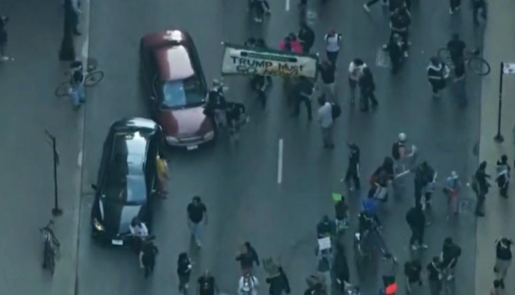 Tuesday’s footage from FOX 32 Chicago shows what appeared to be a woman driving through the Chicago demonstrators walking with signs and biking on Wabash and Monroe.