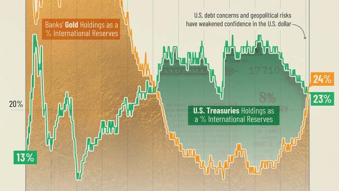 Central banks have crossed a symbolic line: their combined gold reserves now exceed their U.S. Treasury holdings for the first time in nearly three decades.