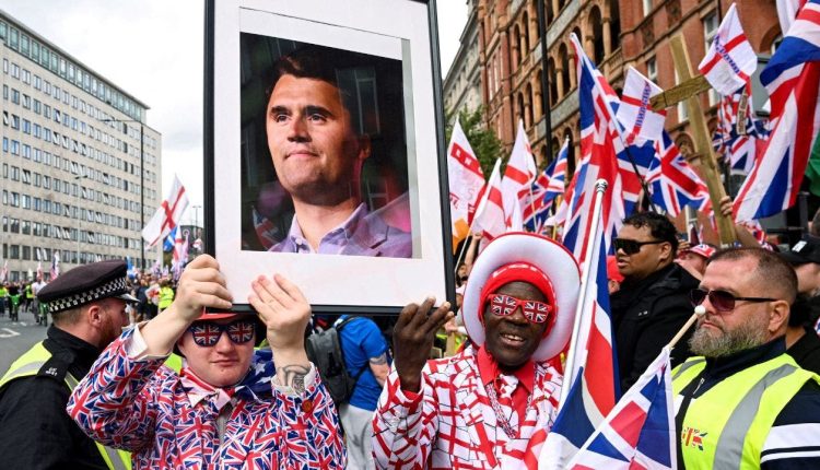 The rally was organized by activist Tommy Robinson, who said the video was shown to thank and “honor the life of one of our generation’s greatest.” Elon Musk also appeared via video link and condemned the left as “the party of murder” following Kirk’s death.