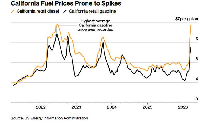California is highly exposed to the disruption rippling across commodity markets because it imports about 20% of its refined fuels from Asia. But as extensively discussed here, oil product shipments from China, South Korea, Singapore and elsewhere are at risk of slowing significantly as Iran blocks the Strait of Hormuz, leaving Asian nations struggling to meet their own demand at home let alone export to California.