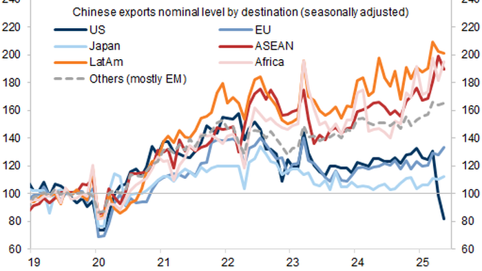 The moderation in headline export growth reflects the continued fall in China’s exports to the US with another 17% sequential decline after seasonal adjustment. Meanwhile, the decline in imports appears widespread, consistent with fewer working days in May compared with a year ago.