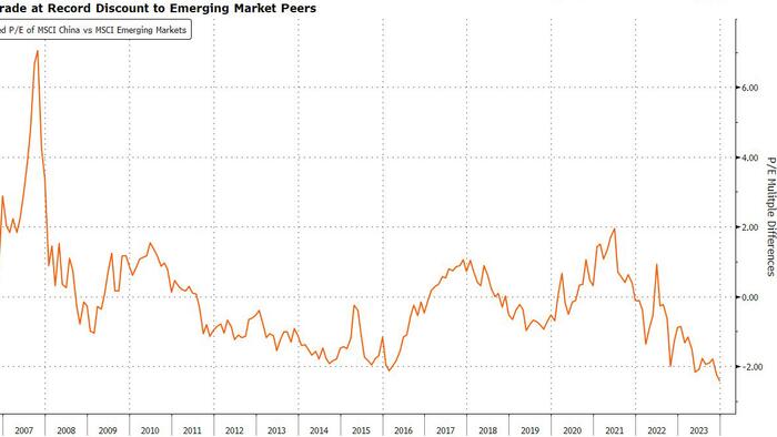The MSCI China Index is trading at 8.9 times of earnings over the next 12 months, compared with 11.4 of MSCI Emerging Markets Index. Apart from a brief period at the onset of the pandemic, the 22% discount marks the biggest since Bloomberg started to compare the data in 2006.