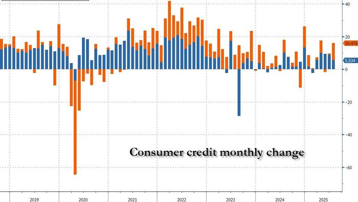 One month after we reported that US consumers appeared tapped out following the first consecutive 2-month stretch of declines in credit card balances, moments ago the Fed published the latest monthly consumer credit data and once again it was a bit of a brainteaser. That’s because after several months of weak credit creation, July saw the second highest monthly increase of 2025 with a total of $16.0 billion in credit, up almost double from the revised June print of $9.6 billion (vs the unrevised number of $7.4 billion), and well above the $10.2 billion median estimate.