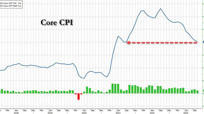 A similar picture emerged on core CPI, where the October MoM print was 0.2%, below the 0.3% consensus estimate and down from the 0.3% increase in Sept, while YoY managed to drop from 4.1% to 4.0% missing expectations of an unchanged print, and the lowest since Sept 2021!