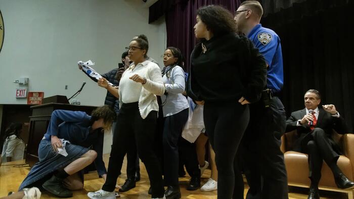 Cuomo was in mid-sentence on the stage at Medgar Evers College in Brooklyn when the group of perhaps 10 protesters stormed the stage, some shouting “Fuck you, Cuomo!” They tried but failed to unfurl a long banner — as NYPD officers wearing “Community Affairs” shirts quickly moved to intercept them.