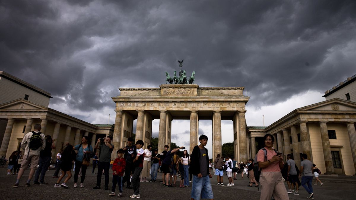 In the photo, we can see Putin against the colours of the Russian flag, with the balloon flying over the Brandenburg Gate and the Fernsehturm, or TV Tower.