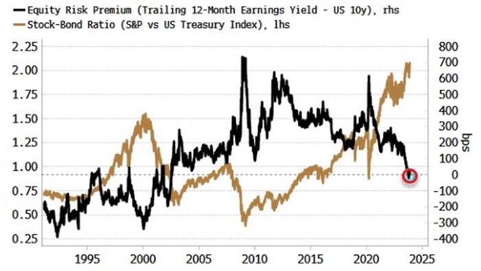 The equity risk premium for the S&P 500 (trailing 12-month earnings yield versus US 10-year yield) is close to zero, making stocks as pricey as they’ve been versus bonds since 2002.