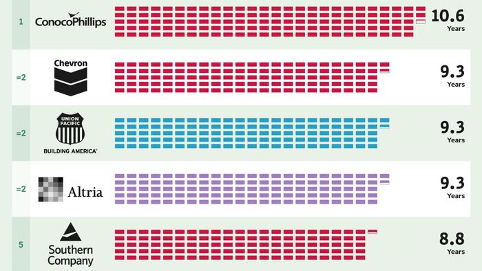Resume.io ranked the top 100 companies by market cap in the U.S. and UK based on their average employee tenure through an analysis of their LinkedIn pages.