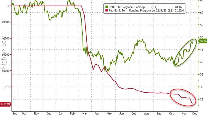 And usage of The Fed’s Bank Term Funding Program (expensive bank bailout fund) exploded higher by $7.8BN (biggest increase since April) to $122BN (a new record high)…