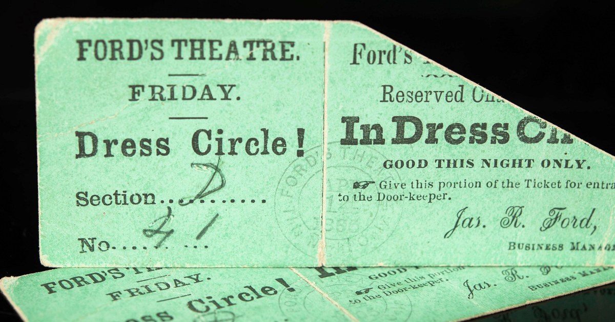 The tickets are stamped with the date, “Ford’s Theatre, APR 14, 1865, This Night Only.” They bear the left-side imprint “Ford’s Theatre, Friday, Dress Circle!” and are filled out in pencil with section (“D”) and seat numbers “41″ and “42”, according to RR Auction.