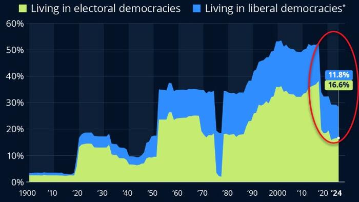 By 2024, just 28 percent of the world’s population, or 2.3 billion people, lived in electoral or liberal democracies, down from almost 4 billion people in 2016.