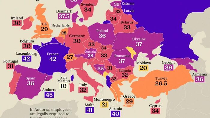 Several countries stand out for offering more than 40 days of paid leave annually. Andorra tops the ranking with 45 days, including 31 paid vacation days and 14 paid public holidays.