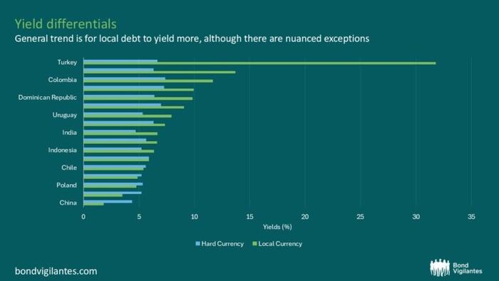 This autonomy does come with a cost, however. We would typically expect debt issued in local currency to yield more relative to its hard currency counterparts, so that investors are appropriately compensated for currency risk and the inflationary background within the issuing country. But the reality can be more nuanced than that, as highlighted by the chart below, which highlights the current yield on a country’s debt issued in either hard, or local, currency.