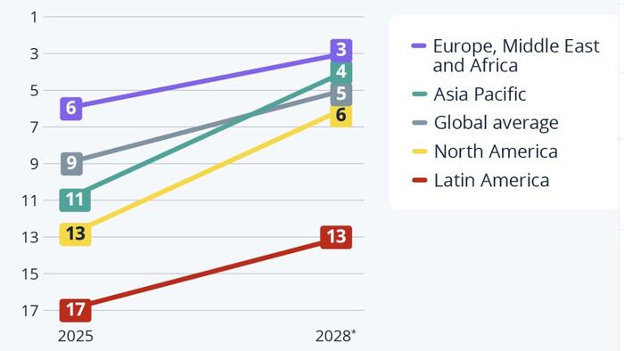 As Statista’s Katharina Buchholz details below, geopolitical risk rose from rank 21 in 2023 to rank 9 in 2025 and, according to business leaders, is expected to climb further to rank 5 by 2028.