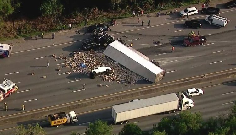 Sandy Springs Police Department confirmed to FOX 5 Atlanta that the 18-wheel tractor-trailer was carrying 80,000 pounds of frozen rotisserie chicken when it crashed in a seven car pileup on I-285 at approximately 6 p.m. on Wednesday.