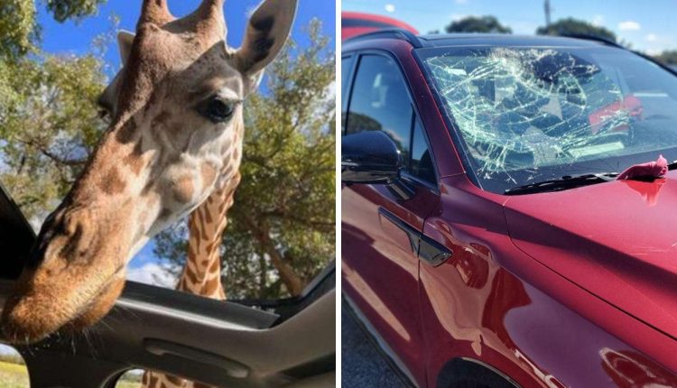A Texas family got a big surprise this week when a giraffe they were feeding at a wildlife park lost its footing and crashed into their car’s windshield.
