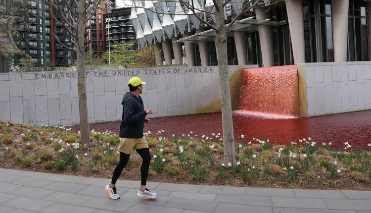 “We’ve turned the embassy pond blood-red because U.S. weapons continue to fuel an indiscriminate war that’s seen bombs dropped on schools and hospitals, entire neighborhoods blasted to rubble, and tens of thousands of Palestinian lives obliterated,” Areeba Hamid, co-executive director at Greenpeace UK, said in a statement.
