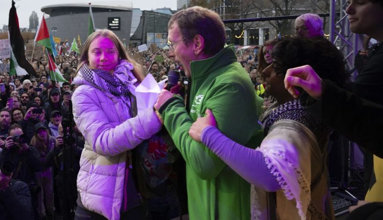 A small group of activists at the front of the crowd near the stage interrupted the event before Thunberg’s speaking time, waving Palestinian flags and changing pro-Palestinian slogans.