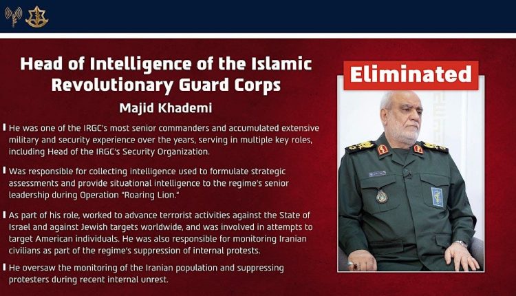 Israel announced that Iran’s Islamic Revolutionary Guard Corps’ intelligence chief Brig. Gen. Majid Khademi was killed in a precision strike, with an Israeli official noting that Quds Force’s special operations commander Asghar Bagheri was eliminated at the same time.