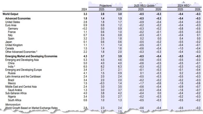 In its latest World Economic Outlook report published this morning, the IMF cut its 2025 global GDP forecast to 2.8%, and trimmed its 2026 GDP view to 3.0%. In January, the IMF predicted the world economy would expand 3.3% both this year and in 2026. The US saw the biggest growth cut, its GDP now expected to grow 1.8% and 1.7%, revised lower by 0.9% and 0.4%, respectively. The EU GDP was also trimmed but far less, to 0.8% and 1.2% in 2025 and 2026, down from 1.0% and 1.4% (expect a full-blown deflationary collapse in the old continent in a few months once China starts dumping all of its trinkets it can no longer sell in the US).