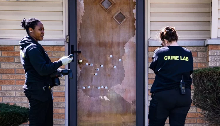 Images from the scene show a front door riddled with bullet holes and an outer glass door completely shattered by the gunfire.