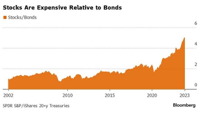 The ratio has doubled since the end of the 2019, just before the pandemic struck, with the Federal Reserve’s 525 basis points of policy tightening since then wreaking havoc with bond valuations even as stocks have shrugged off the onslaught.